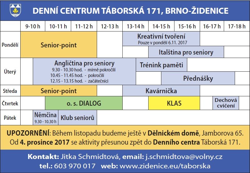 Pondělí: 9-12 Senior-point, 14-17 Italština pro seniory, 13-16 Posezení s tvořením